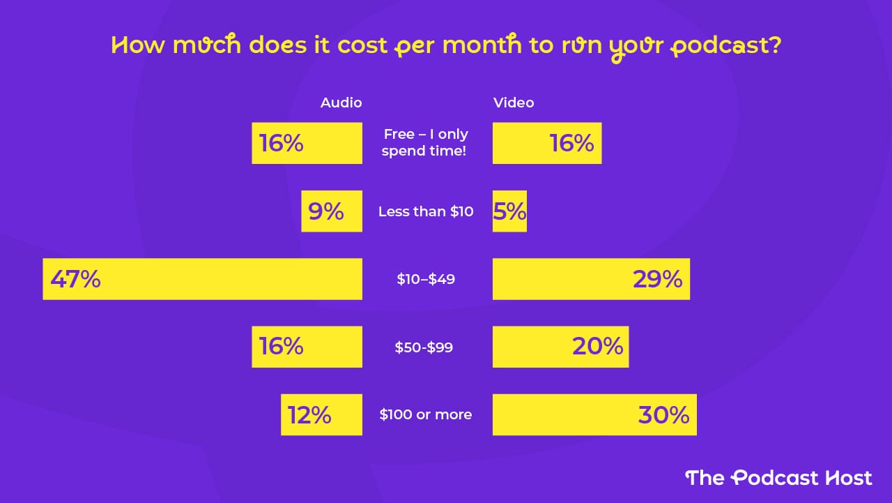 Data from the Independent Podcast Report showed that almost half of audio-only respondents spent between $10 and $49 per month running their show, compared to 29% of the video podcasters.