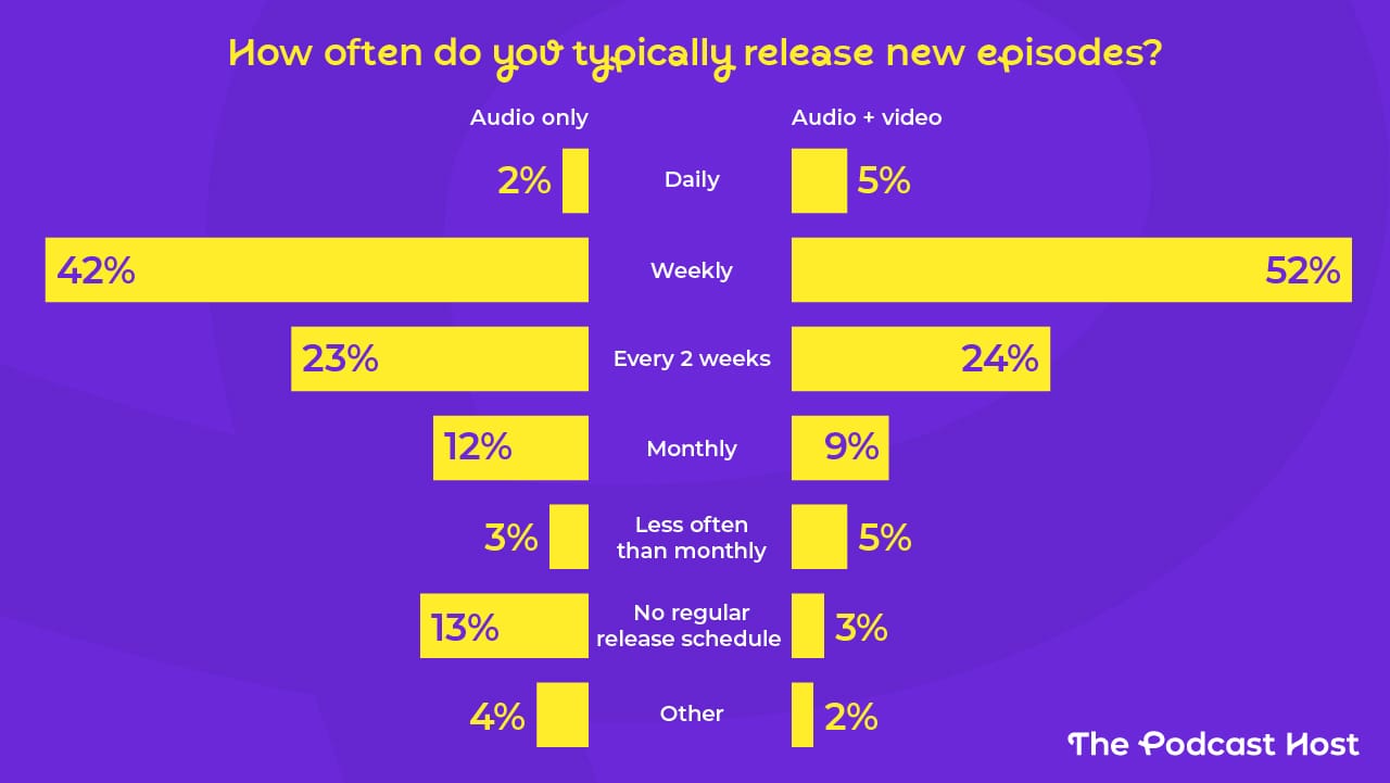 Video podcasters are also more likely to hit a weekly release schedule, and less likely to have no regular release schedule. There could be more to this than minimalist production workflows. The desire to "feed" algorithms could be a factor here, too.