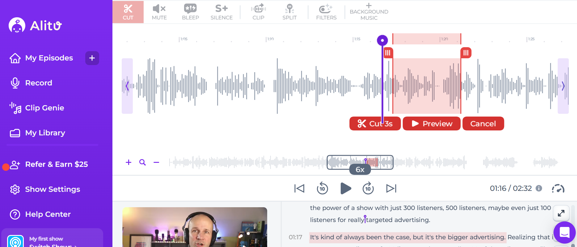 You can record your video directly in Alitu, full local quality, then handle editing in the same place. Alitu automatically balances volume levels, cleans up background noise, and applies EQ, which matters because clear audio is still the foundation of any video podcast. You can remove filler words and long silences with one click, split clips, cut unwanted sections, and even edit your video by deleting text from its automatically generated transcript. Alitu costs $38 per month or $380 a year (two free months), and there's a free trial so you can test it all out for yourself!